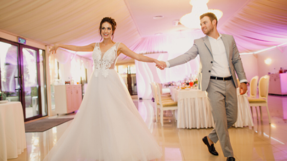 Let's start by talking about the entrance of your first dance. This entrance will be your walk onto the dance floor, and will take place during the beginning of your music (before the main part of your song kicks in)